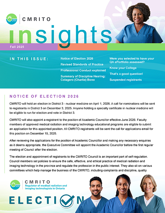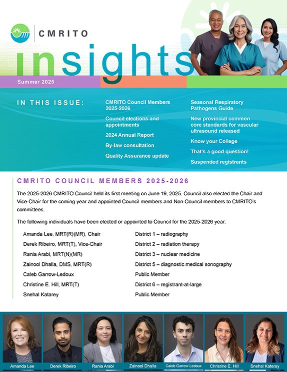 The CMRITO provides the public and medical radiation and imaging technologists with information in ways that are most convenient and useful to them. In this section you will find digital versions of our current publications as well as past editions.